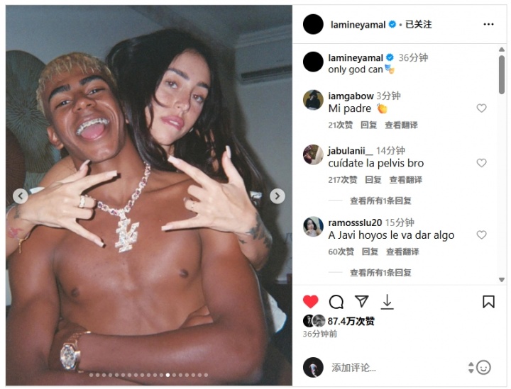 顶流情侣发糖🥰亚马尔赤裸上身与女友大秀恩爱,戴40万镶钻项链