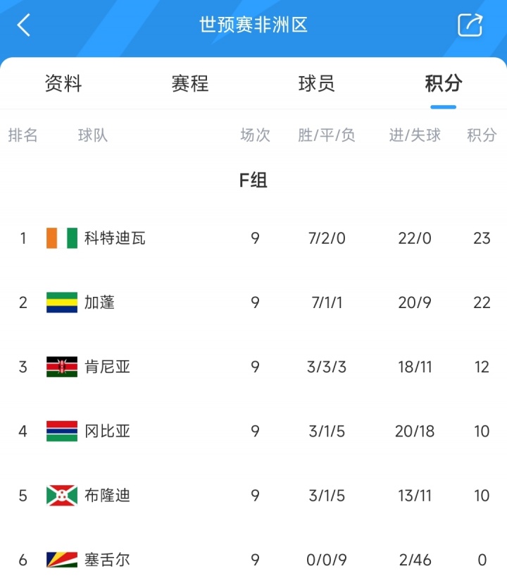 至此,在预选赛还剩1轮的情况下,欧洲杯直播吧科特迪瓦领跑 第二加蓬1分+11个净胜球,主动权仍握在手中。此外,除了9个小组第一直通世界杯赛 ,非洲区9个小组中最好的4个第二将角逐附加赛名额。