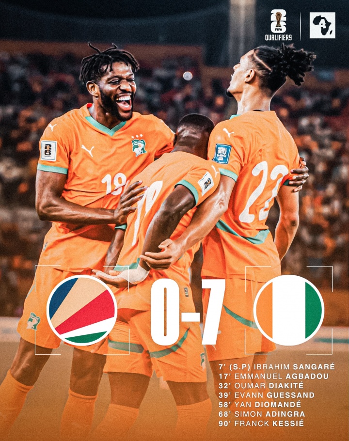 距世界杯赛 一步之遥!科特迪瓦7-0塞舌尔,领跑 第二1分+11个净胜球