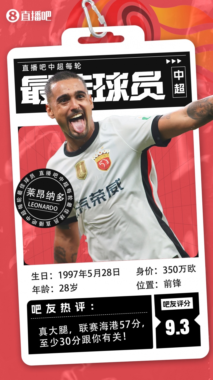 - 【】中超第27轮最佳球员:真大腿莱昂纳多,怎么打怎么有!