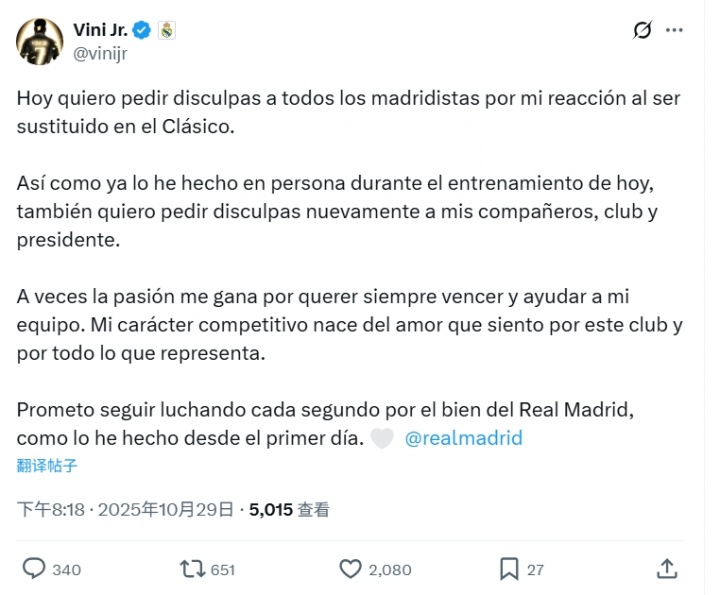 10月29日讯 维尼修斯在国家德比中,因不满被换下,直接走回更衣室。今日,维尼修斯社媒就不满被换下向皇击鞠 迷、队友、俱乐部和主席致歉。