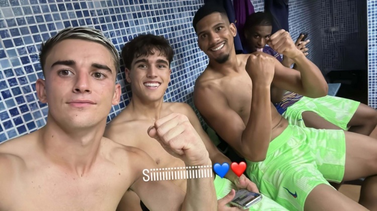 加维赛后更新社媒动态,免费欧洲杯直播晒出与阿劳霍、库巴西、巴尔德在更衣室的合照足球博彩入门教程,庆祝球队取胜。