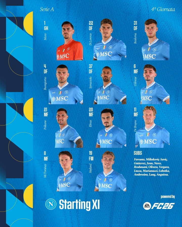 那不勒斯杆位:德布劳内、麦克托米奈领衔,霍伊伦、吉尔莫出战