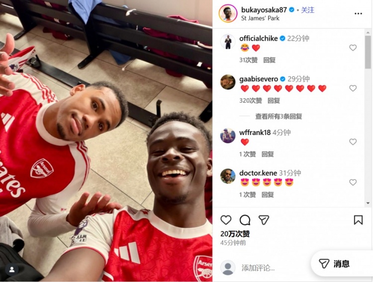 - 笑得阳光!萨卡社媒晒和加布里埃尔合照庆祝2-1反转 纽卡