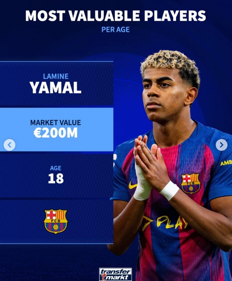 11月9日讯 《转会市场》统计了16岁到25岁的各年龄最高身价情况,18岁亚马尔2亿欧居首。