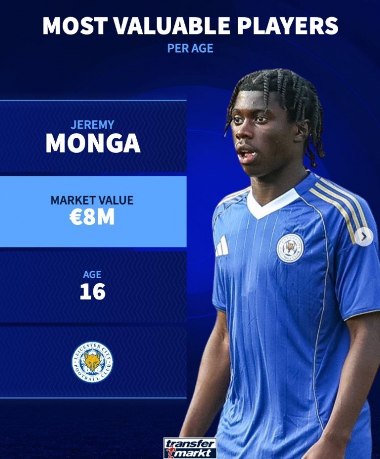 16岁:杰里米·蒙加(莱斯特城),800万